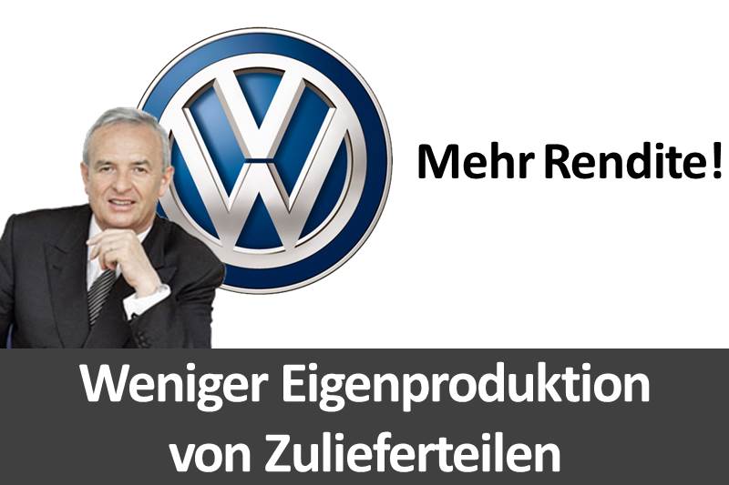 Volkswagenchef Winterkorn hat in einer Rede im Juli 2014 das Renditeziel von sechs Prozent ausgerufen – derzeit liegt der Konzern bei zwei Prozent, Tendenz der letzten Monate eher weiter fallend. Winterkorns Strategie: Volkswagen soll die eigene Komponentenfertigung einschränken und verstärkt auf Teile der Ihnen bekannten Erstausrüstern setzen. Dies kann langfristig auch Auswirkungen auf Ihre Stellung im Markt haben.