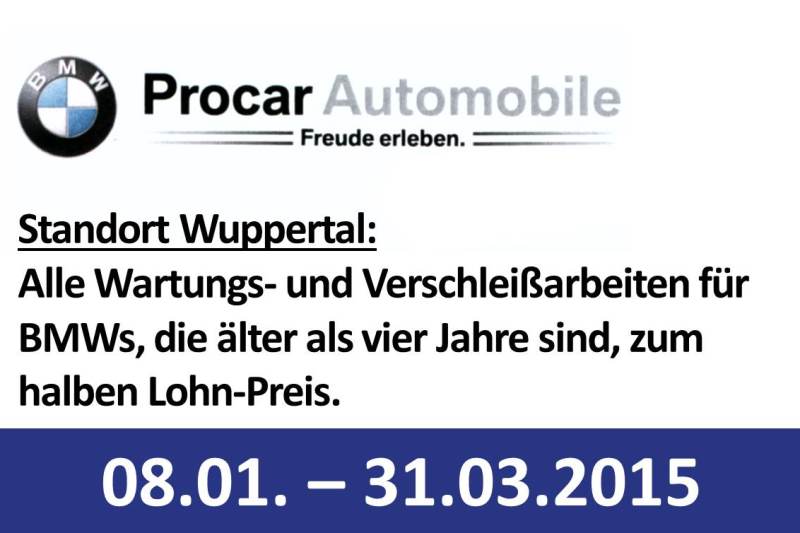 Mit einem Schreiben vom 08. Januar informiert der BMW Procar Standort Wuppertal Kunden darüber, dass im Zeitraum bis 31. März 2015 für BMWs, die älter als 4 Jahre sind, alle Wartungs- und Verschleißarbeiten zum halben Lohn-Preis durchgeführt werden. Neben A.T.U befeuern nun also auch einzelne Vertragsbetriebe das ruinöse Preismarketing.