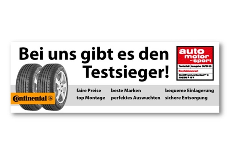 Sie wollen sich nicht unter Preis verkaufen? Dann lassen Sie sich nicht auf die Kampfpreisspirale mit Sonderangeboten ein. Bleiben Sie Ihrer Qualitätslinie als Kfz-Meisterbetrieb treu. Setzen Sie in der Werbung beispielsweise auf Testsieger-Reifen und reichern Sie Ihr Premium-Angebot mit dem Mehrwert Reifenversicherung an. Die passenden kostenlosen Web-Banner für Ihre Website finden Sie hier: