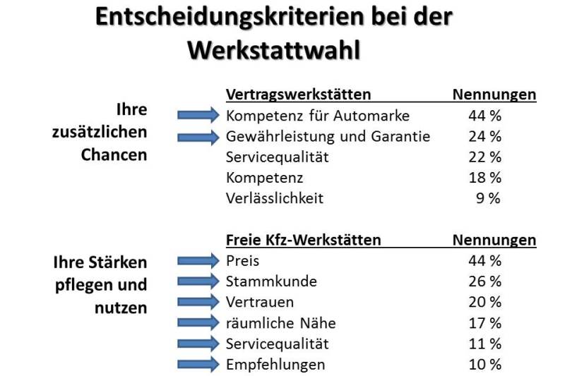 Je nachdem welche Studie oder Befragung man bemüht… mal fallen die Ergebnisse so aus, mal so. Relativ deckungsgleich sind die Resultate jedoch bei der Fragestellung, warum Kunden die Vertragswerkstätten aufsuchen und wann diese freie Kfz-Werkstätten bevorzugen. Beschäftigt man sich dann mit den Gründen der beiden Kundengruppen, so lässt sich damit eine strategische Ausrichtung für freie Kfz-Unternehmer begründen.