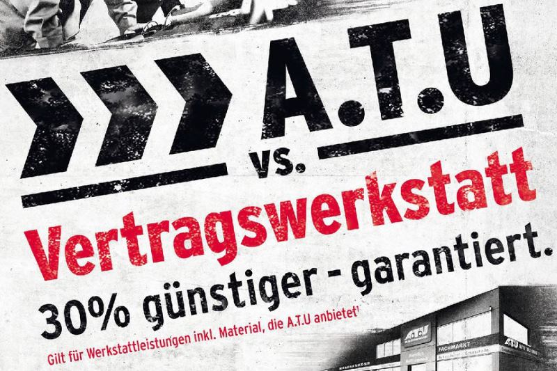 Auszug aus A.T.U Prospekt 03.-17.01.2015Mit der Aussage "A.T.U vs. Vertragswerkstatt …30% günstiger – garantiert" versucht die Werkstattkette derzeit Kunden in die Betriebe zu locken. Dabei wird versprochen, das vorliegende Angebot einer Vertragswerkstatt im Umkreis von 30 km um 30% zu unterbieten. Ist das wirksames Marketing oder ein verzweifelter Versuch? Wir haben eine A.T.U-Filiale besucht und uns zur Aktion Gedanken gemacht.