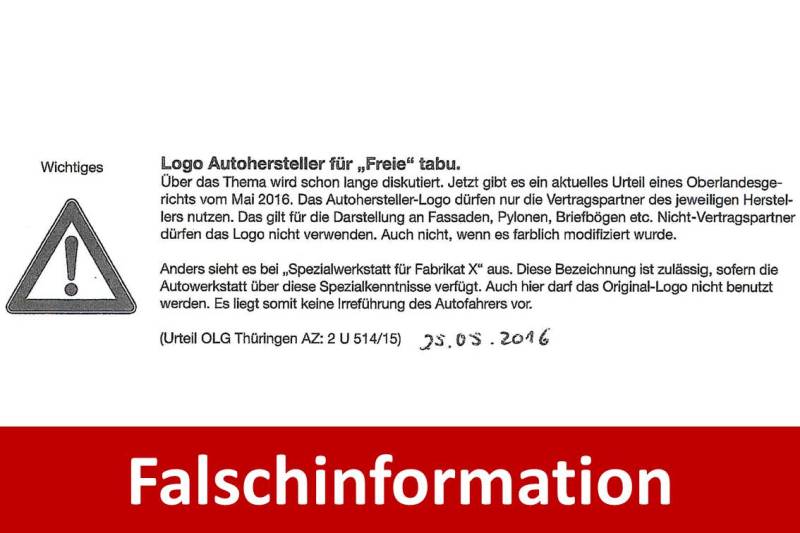 Einige Kollegen informierten uns darüber, dass der Großhändler Matthies im Mai 2016 seine Werkstattkunden mit einem Beileger darüber informierte, die Logos der Autohersteller seien laut einem Urteil des OLG Thüringen (Az. 2 U 514/15) für Freie tabu. Nach Rücksprache mit unserem Netzwerkanwalt, u.a. Experte für Marken- u. Wettbewerbsrecht, sind die Infos als Falschinformation einzustufen. Wir machen Sie schlau!